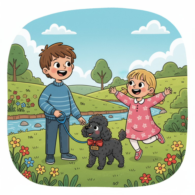 In einem gemütlichen kleinen Haus lebte die kleine Rosi, ein schwarzer Pudel mit einem großen Herzen. Sie wuchs mit ihren zwei Schwestern, ihrem Bruder, ihrer Mama Jule, ihrem Papa Neo und ihrer Tante Ella auf. Gemeinsam erkundeten sie den Garten, spielten fröhlich den lieben langen Tag und erlebten viele Abenteuer. Rosi liebte es besonders, mit ihren Menschen zu kuscheln.