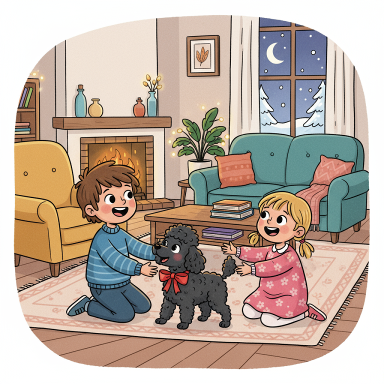 Dort saß Rosi, eine rote Schleife um den Hals, und wedelte aufgeregt mit dem Schwanz. Der Junge riss die Augen auf. „Ein Hund? Ist das unser Hund?“ Mama nickte lächelnd. „Ja, das ist Rosi. Sie gehört jetzt zu uns.“ Das Mädchen klatschte begeistert in die Hände, und beide Kinder knieten sich vorsichtig zu Rosi, um sie zu begrüßen.